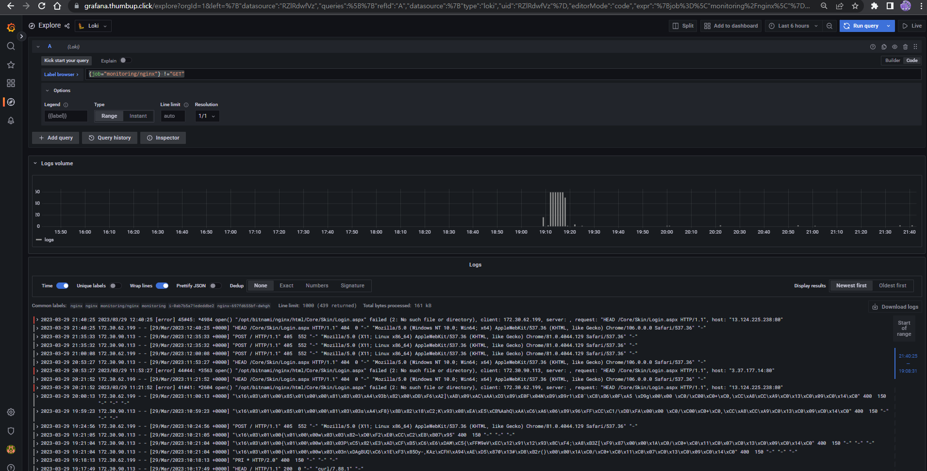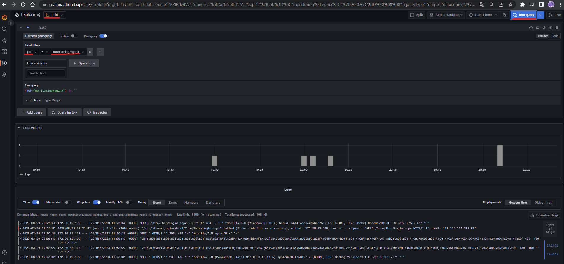 172.30.62.199 - - [29/Mar/2023:13:12:39 +0000] "GET / HTTP/1.1" 200 615 "-" "curl/7.88.1" "-"