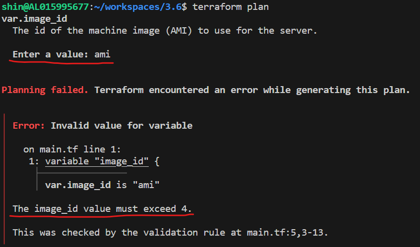 - 변수 블록 내에 validation 블록에서 조건인 condition에 지정되는 규칙이 true 또는 false를 반환해야 하며, error_message는 condition 값의 결과가 false 인 경우 출력되는 메시지를 정의한다.