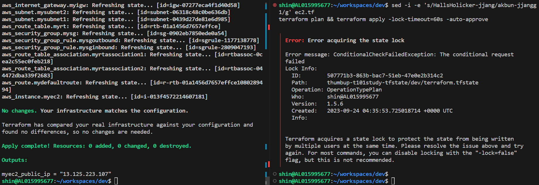 - apply 실행 시 테라폼은 자동으로 잠금을 활성화, -lock-timout=