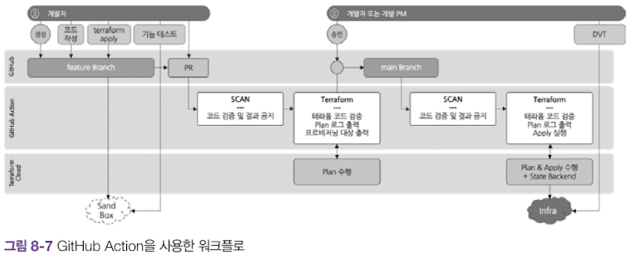- 코드 자체 외에도 테라폼의 Plan 결과를 풀 리퀘스트 단계에 같이 제공하면 영향을 받는 리소스와 서비스 중단에 대한 예측이 더 쉬워진다.
