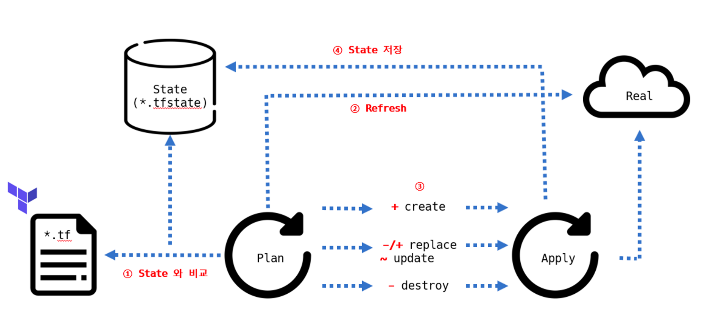 리소스 생성 대상(클라우드 등)과 State를 기준으로 비교하는 과정을 거친다.