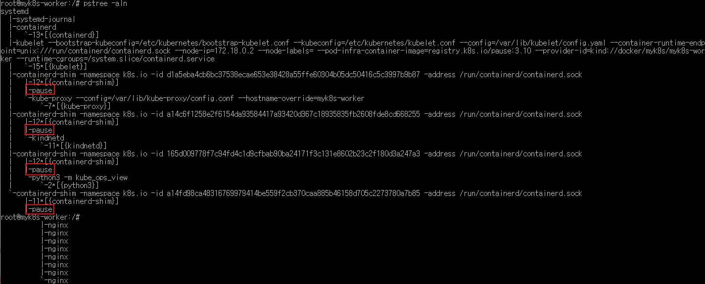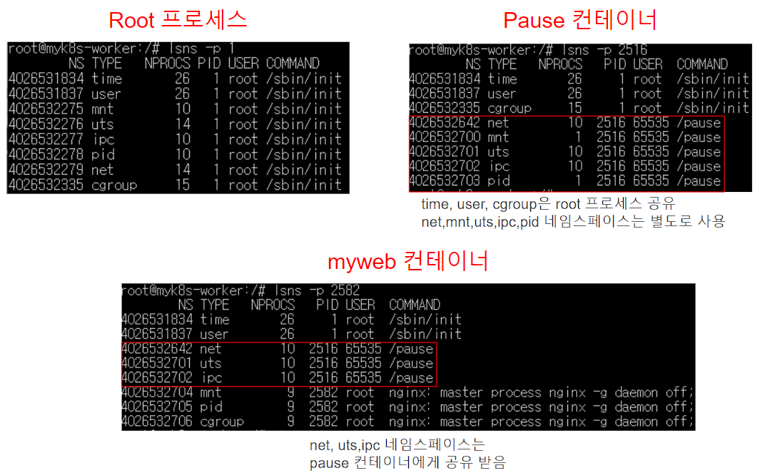 pause 컨테이너가 네임스페이스 공유 역할을 하는 것을 알아보았다.