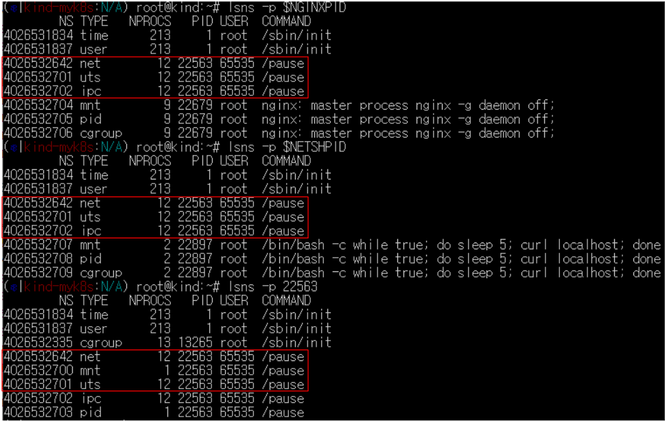 net, uts, ipc 네임스페이스를 공유하는 것을 알 수 있다.