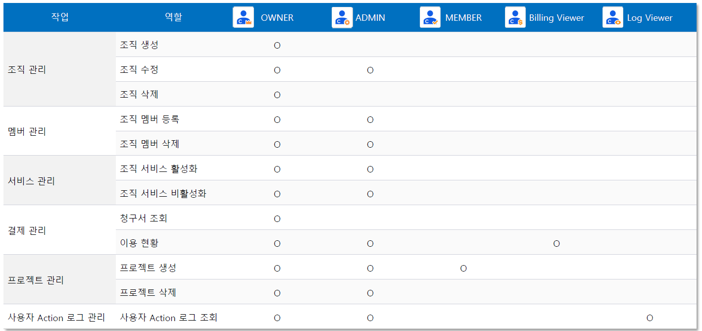 | - 멤버 관리 - IAM 관리 - BILLING 결제 관리 - Log 관리 - 프로젝트 관리 - 서비스 관리 |